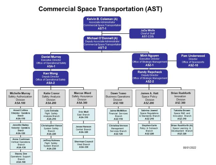 Commercial Space Transportation manages its licensing and regulatory work as well as a variety of programs and initiatives to ensure the health and facilitate the growth of the U.S. commercial space transportation industry through the Office of the Associate Administrator, the Deputy Associate Administrator, the Chief Engineer, the Chief of Staff and with the Operations Directorate and the Management Directorate.