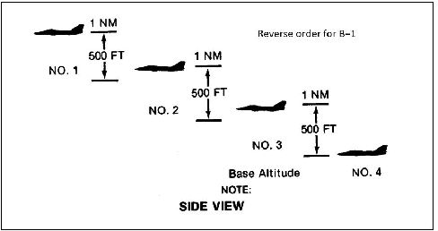 - En route formation: Non-standard with wing aircraft “stacked up” with 500 feet vertical separation and 1 nautical mile interval between aircraft as shown in FIG 7-3-1. The first aircraft maintains the base altitude assigned.