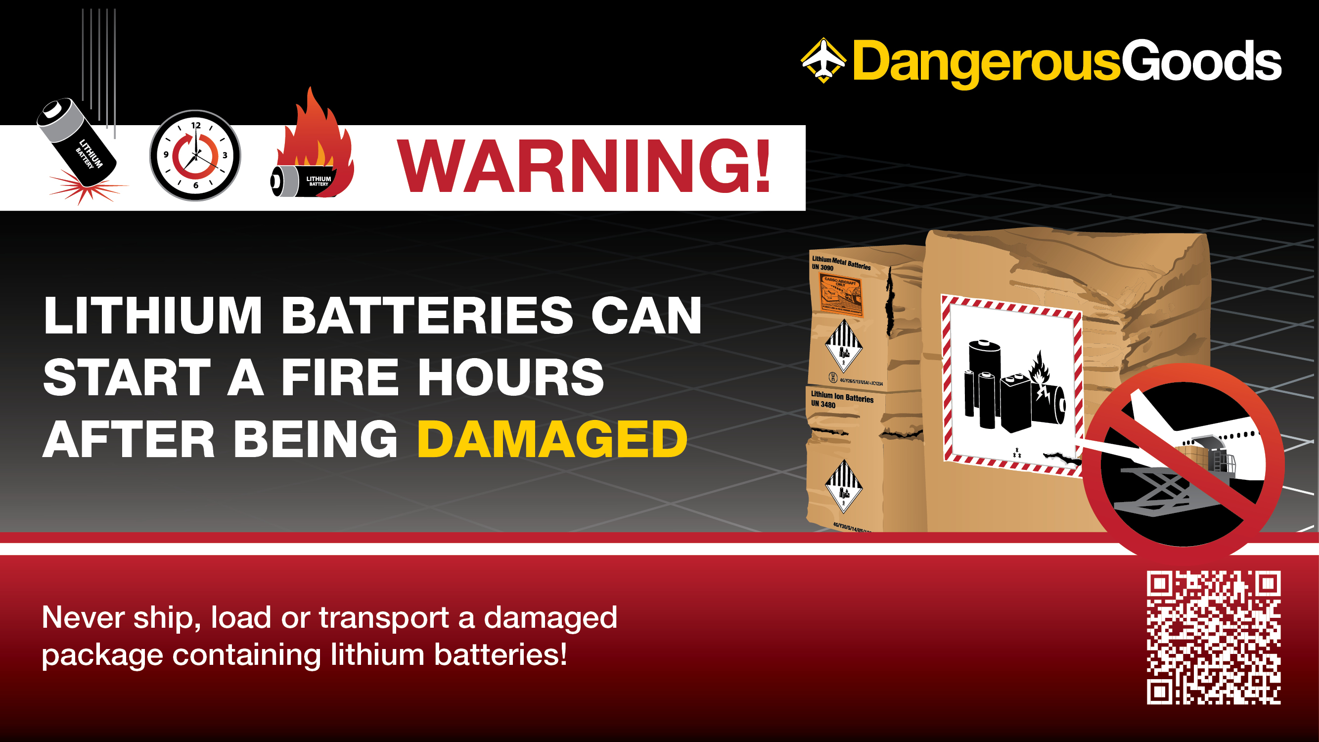Poster: No Damaged Lithium Batteries Cargo. Never ship, load, or transport a damaged package containing lithium batteries. Download the landscape version of No Damaged Lithium Batteries poster.