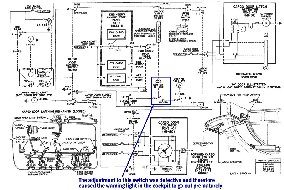 Investigation of the accident revealed that prior to takeoff, the cargo door was not properly latched and locked (see Closing of the Cargo Door) (see NTSB video describing door closure system) and the flight deck aft cargo door warning light (see illustration of flight engineer's panel in the cockpit) went out prematurely because of an incorrectly rigged warning switch.